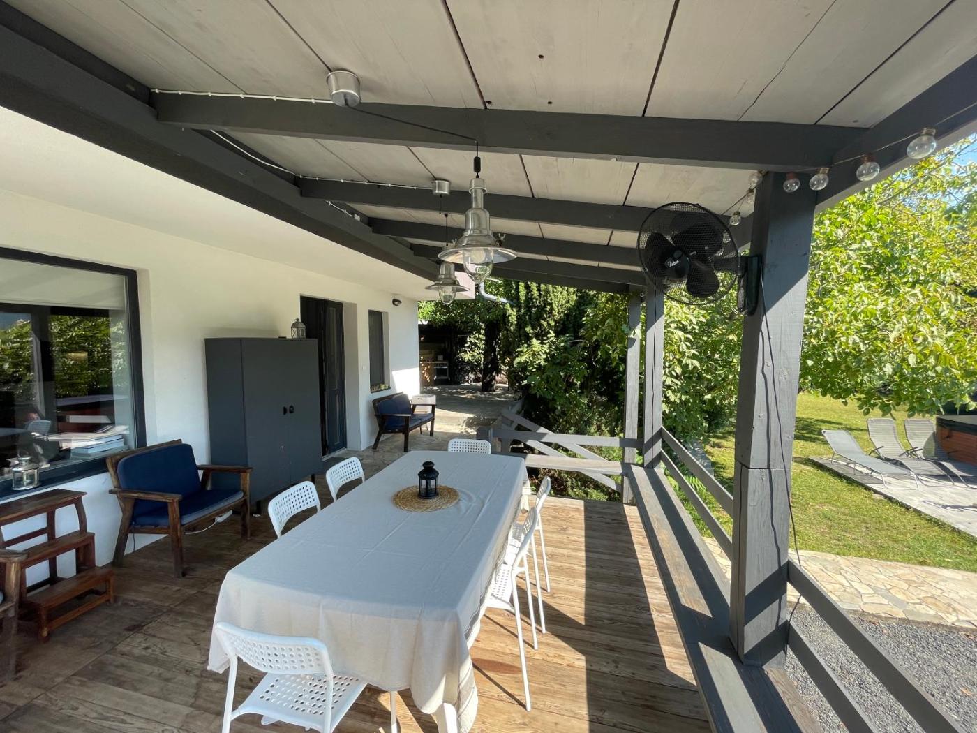 Four-Bedroom House. The private pool and hot tub are the standout features of this holiday home. Guests will find a stovetop, a refrigerator, a dishwasher and kitchenware in the kitchen. The holiday home also includes a barbecue. The holiday home has air conditioning, a washing machine, a tea and coffee maker as well as a terrace with garden views. The unit has 5 beds.