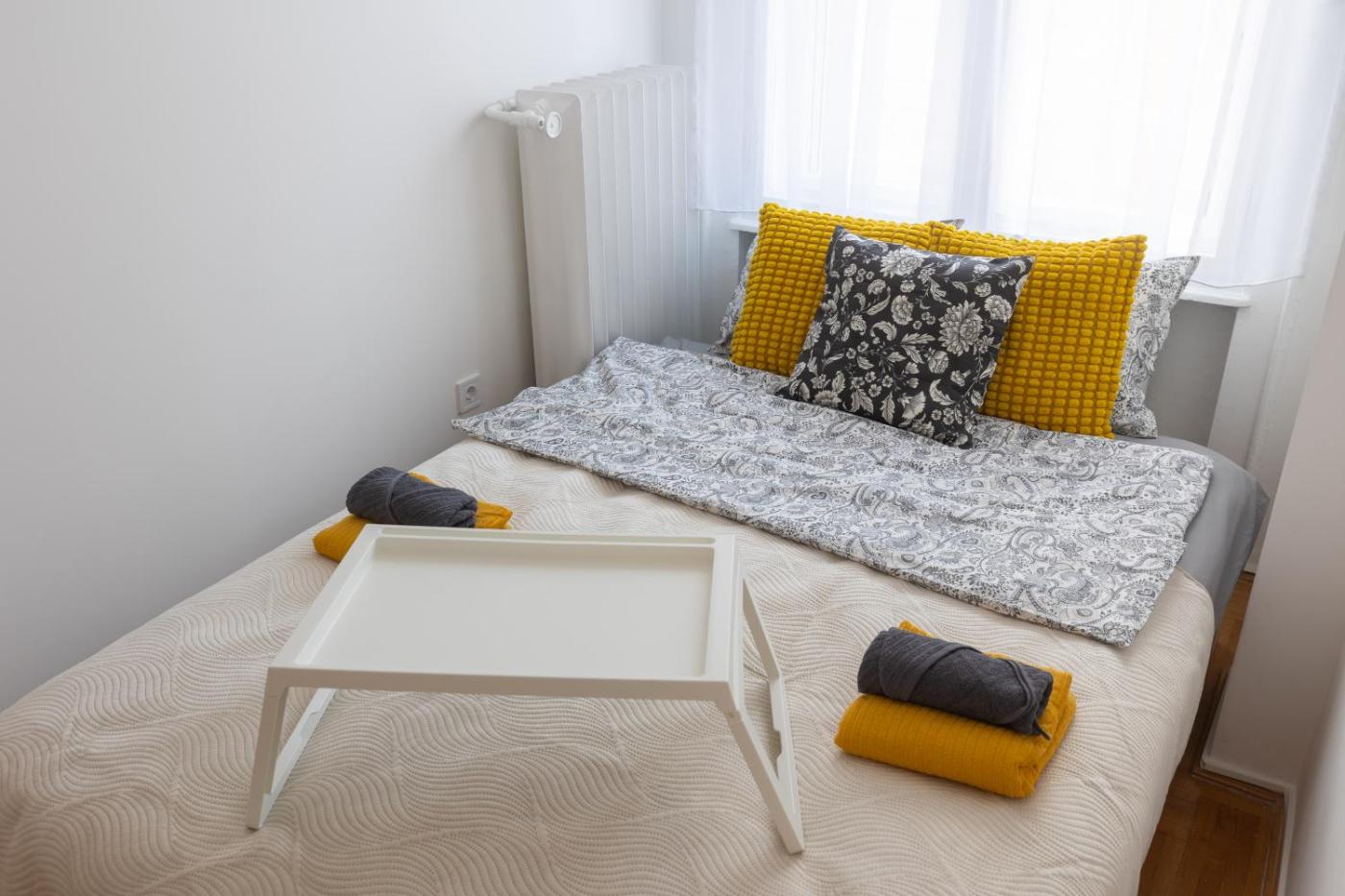One-Bedroom Apartment. Boasting a private entrance, this air-conditioned apartment comes with a kitchen, 1 bedroom and 1 bathroom with a bath and a shower. Meals can be prepared in the well-fitted kitchen, which features a stovetop, a refrigerator, kitchenware and a microwave. The apartment has parquet floors, a seating area with a flat-screen TV, a washing machine, soundproof walls as well as city views. The unit has 2 beds.
