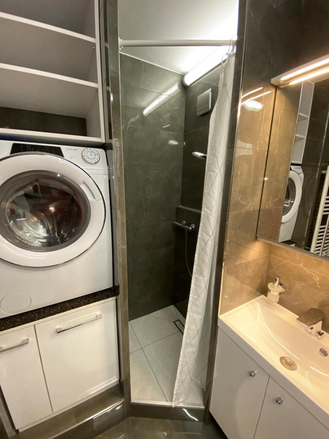 One-Bedroom Apartment. The air-conditioned apartment has 1 bedroom and 1 bathroom with a shower and a hairdryer. Guests can make meals in the kitchen that has a stovetop, a refrigerator, a dishwasher and kitchenware. The apartment features a flat-screen TV with streaming services, a washing machine, a tea and coffee maker, a seating area as well as city views. The unit has 1 bed.